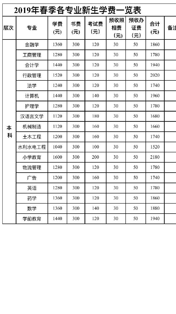 4.附:2019年春季新生各专业缴费标准